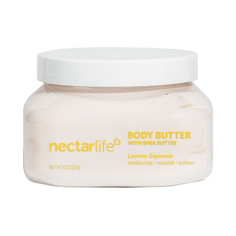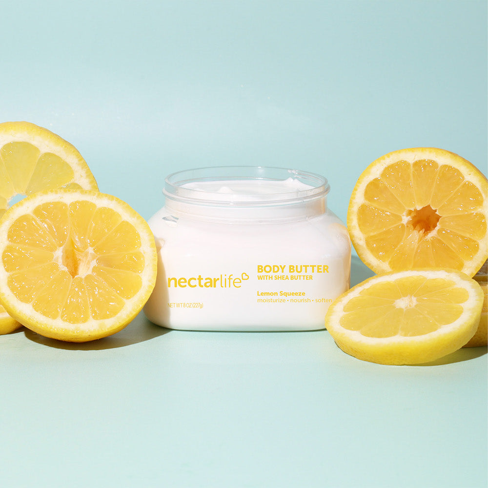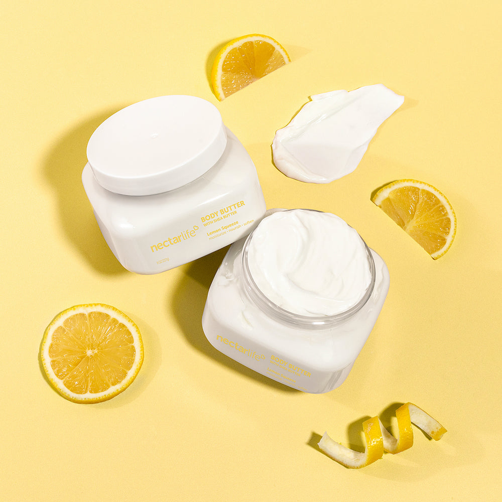 Lemon Squeeze: Aqua (Water), Butyrospermum Parkii (Shea) Butter, Persea Gratissima (Avocado) Oil, Prunus Armeniaca (Apricot) Kernel Oil, Cetearyl Alcohol, Stearic Acid, Cetyl Alcohol, Polysorbate 60, Parfum (Fragrance), Benzyl Alcohol, Phenoxyethanol, Caprylyl Glycol, Tocopheryl Acetate, Maranta Arundinacea Root Powder