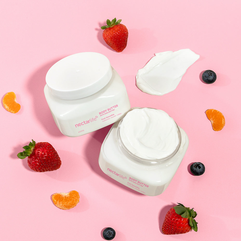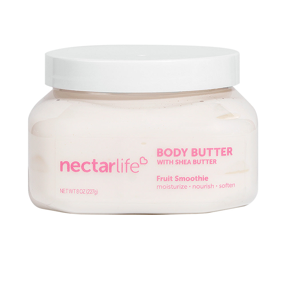 Fruit Smoothie: Aqua (Water), Butyrospermum Parkii (Shea) Butter, Persea Gratissima (Avocado) Oil, Prunus Armeniaca (Apricot) Kernel Oil, Cetearyl Alcohol, Stearic Acid, Cetyl Alcohol, Polysorbate 60, Parfum (Fragrance), Benzyl Alcohol, Phenoxyethanol, Caprylyl Glycol, Tocopheryl Acetate, Maranta Arundinacea Root Powder