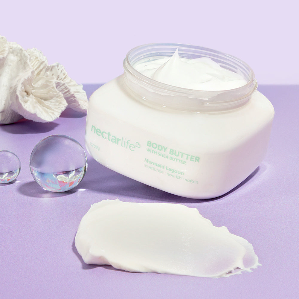 Mermaid Lagoon: Aqua (Water), Butyrospermum Parkii (Shea) Butter, Persea Gratissima (Avocado) Oil, Prunus Armeniaca (Apricot) Kernel Oil, Cetearyl Alcohol, Stearic Acid, Cetyl Alcohol, Polysorbate 60, Parfum (Fragrance), Benzyl Alcohol, Phenoxyethanol, Caprylyl Glycol, Tocopheryl Acetate, Maranta Arundinacea Root Powder